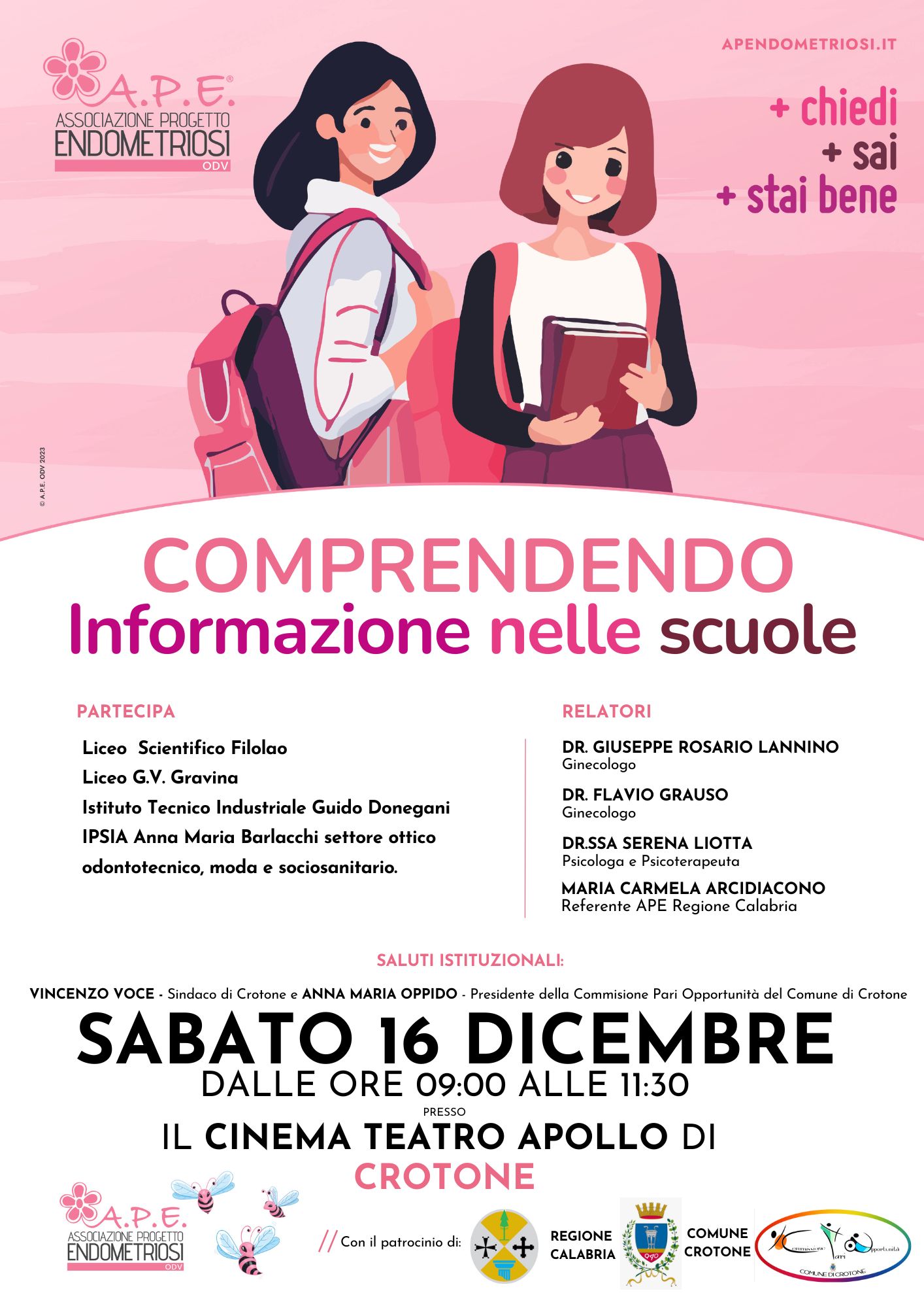 Sabato 16 dicembre dalle ore 9:00 alle ore 11:30 , presso il Cinema Teatro Apollo di Crotone, si svolgerà il progetto COMPREND-ENDO, per portare informazione sull’endometriosi ai ragazzi delle classi di III - IV e V degli istituti superiori.
