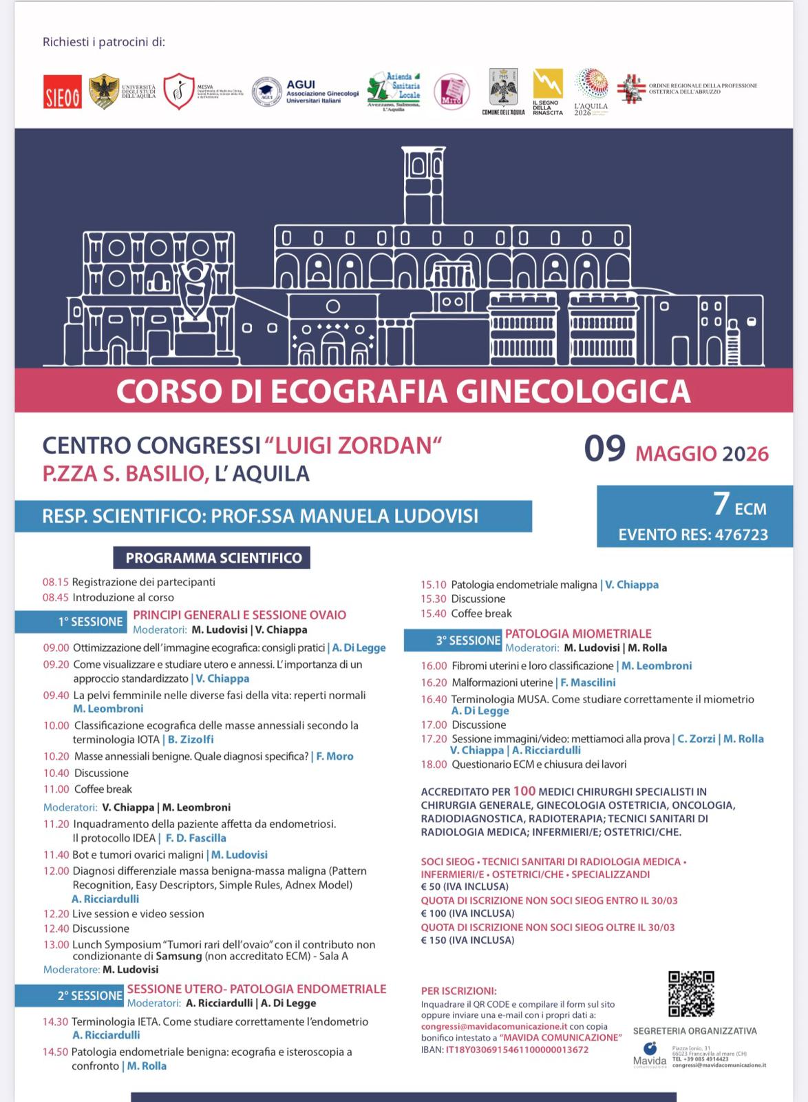 A.P.E. sarà presente sabato 9 maggio 2026 a L’Aquila, in occasione dell’importante Corso di Ecografia Ginecologica che si terrà presso il Centro Congressi “Luigi Zordan”, con la responsabilità scientifica della Prof.ssa Manuela Ludovisi.