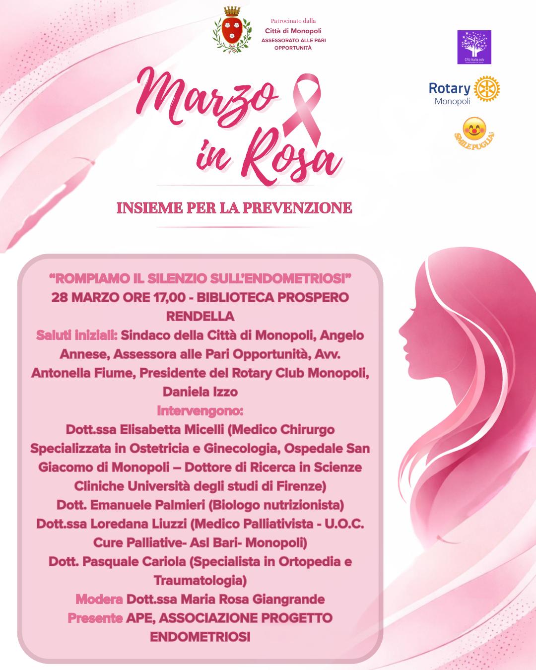 Sabato 28 marzo alle ore 17.00, presso la Biblioteca Prospero Rendella di Monopoli, si terrà l’incontro dal titolo “Rompiamo il silenzio sull’endometriosi”, appuntamento conclusivo della rassegna “Marzo in rosa – insieme per la prevenzione”, promossa con il patrocinio della Città di Monopoli – Assessorato alle Pari Opportunità, in collaborazione con il Rotary Club Monopoli e l’Associazione Smile Puglia.