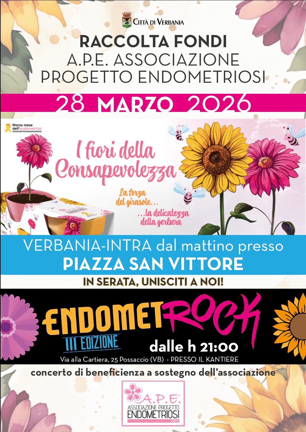 Sabato 28 marzo 2026 A.P.E. ODV – Associazione Progetto Endometriosi sarà a Verbania per una giornata interamente dedicata alla consapevolezza sull’endometriosi e alla raccolta fondi a sostegno delle attività associative.