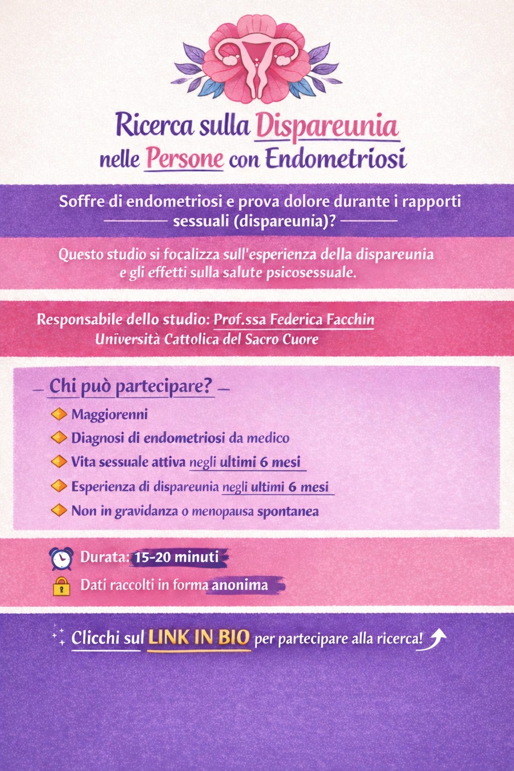 Questa ricerca si focalizza proprio sulla dispareunia, su come le persone con endometriosi la vivono e sugli effetti di questa esperienza dolorosa sulla salute psicosessuale.