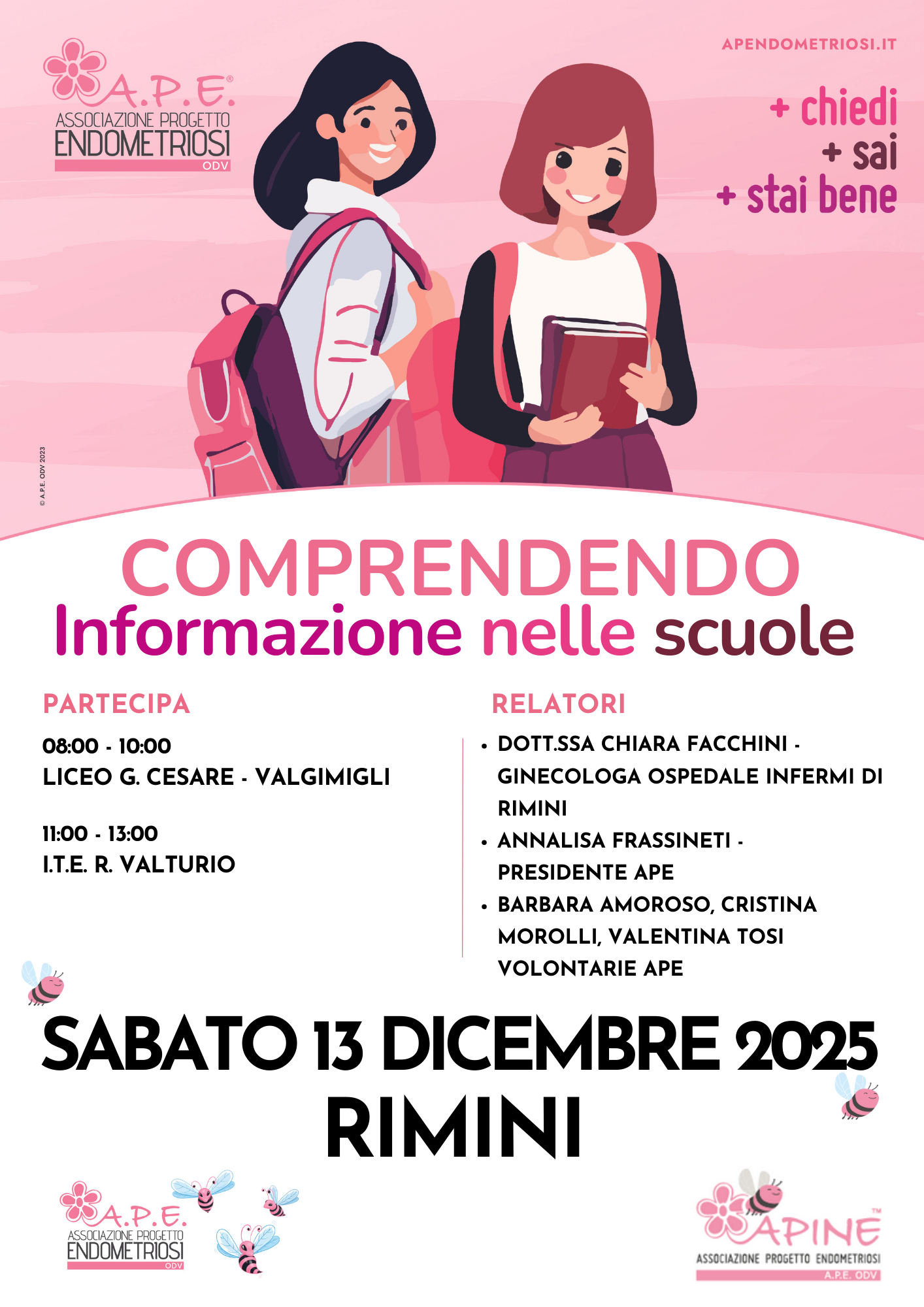 Sabato 12 dicembre 2025, l’APE ODV sarà a Rimini con una nuova tappa del progetto COMPRENDENDO – Informazione nelle scuole, iniziativa dedicata alla sensibilizzazione e all’informazione corretta sull’endometriosi tra le studentesse e gli studenti delle scuole superiori.