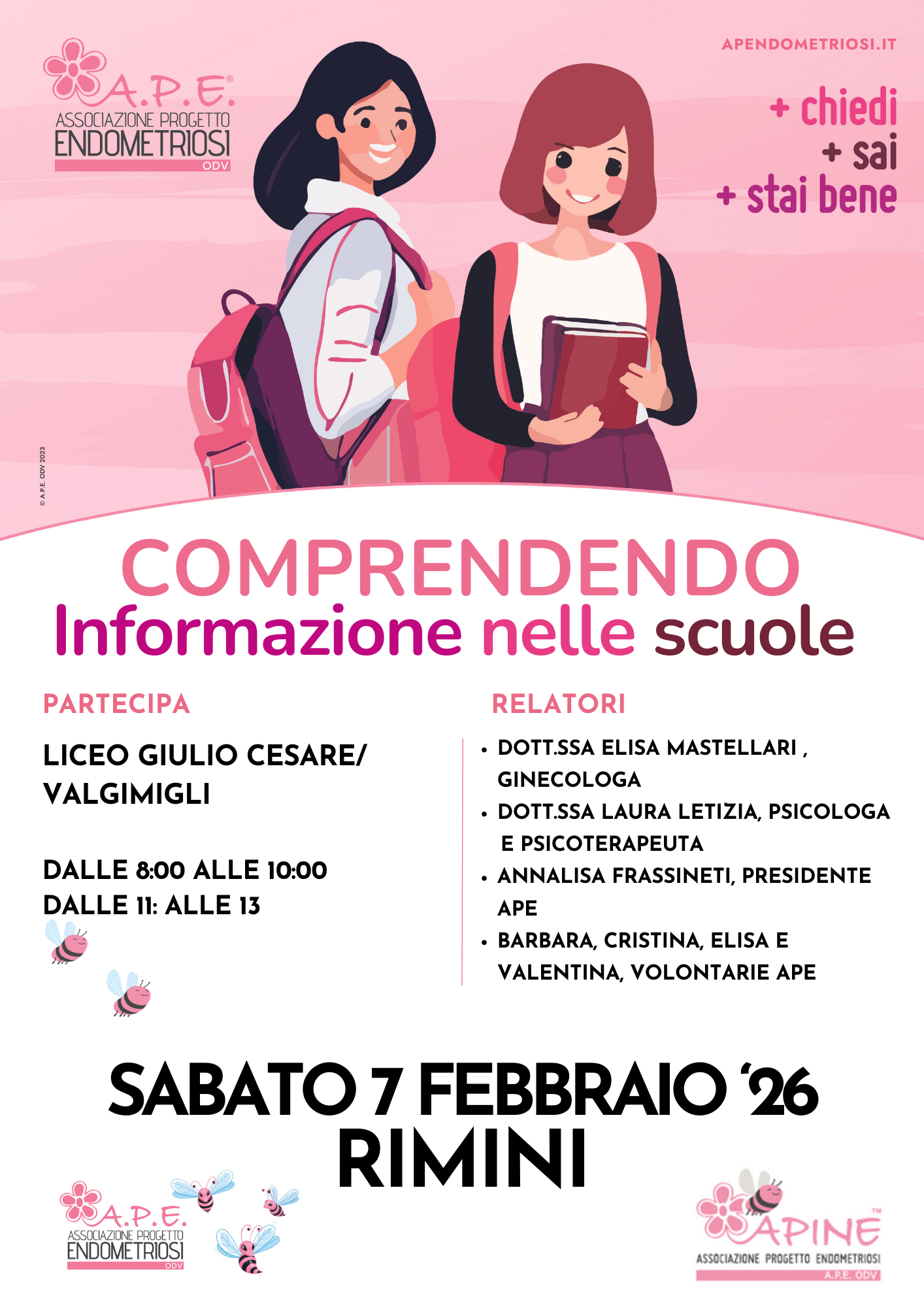 Sabato 7 febbraio 2026 l’Associazione Progetto Endometriosi (A.P.E. ODV) sarà a Rimini con una nuova tappa del progetto COMPRENDENDO – Informazione nelle scuole, dedicato alla sensibilizzazione sull’endometriosi tra le studentesse delle scuole superiori.