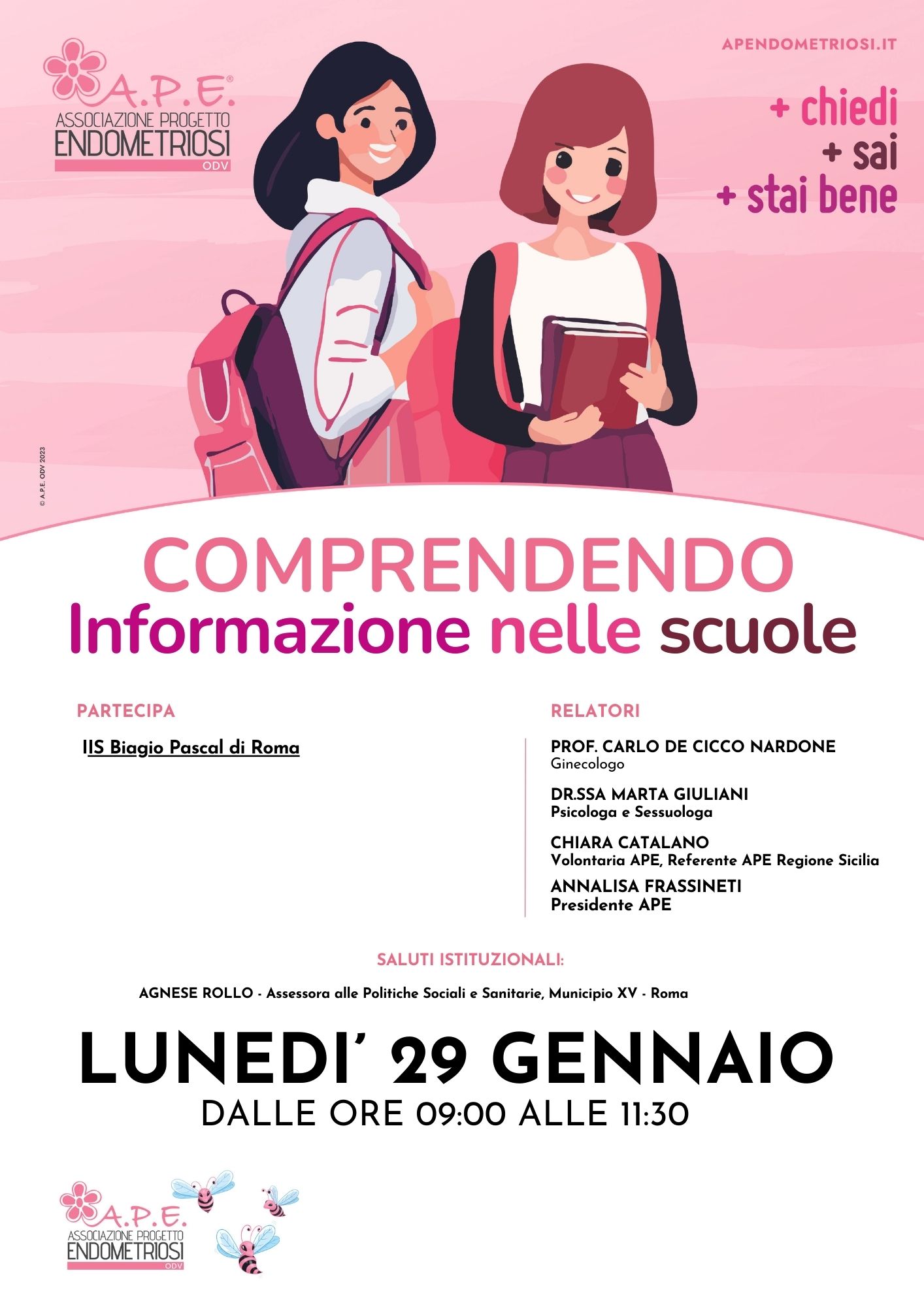 Lunedì 29 gennaio dalle ore 9:00 alle ore 11:30 , presso l'ISS Pascal di Roma, si svolgerà il progetto COMPREND-ENDO, per portare informazione sull’endometriosi ai ragazzi delle classi di III - IV e V degli istituti superiori.