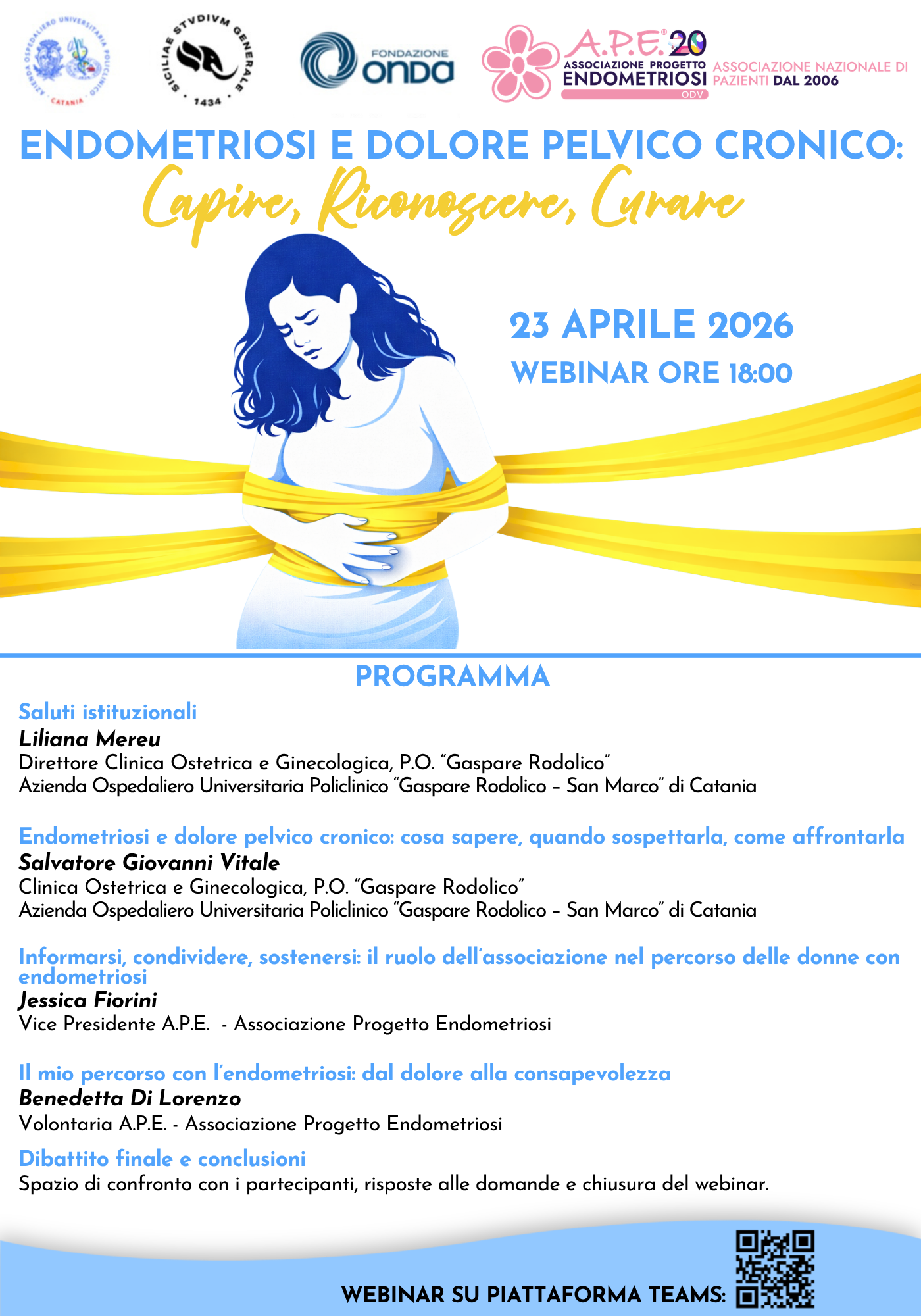 Giovedì 23 aprile 2026 alle ore 18.00, A.P.E. – Associazione Progetto Endometriosi sarà tra i relatori del webinar “Endometriosi e dolore pelvico cronico: capire, riconoscere, curare”, un importante appuntamento di approfondimento e sensibilizzazione dedicato a una patologia ancora troppo spesso sottovalutata.